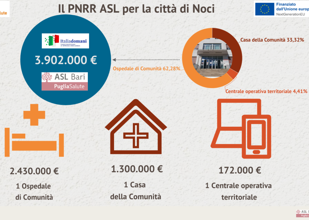 La Sanità del territorio di Noci si rafforza decisamente. Sin da subito, con la presenza in aggregazione dei medici e pediatri ospitati nel PTA, e in prospettiva grazie al PNRR che, nel medio termine, garantirà investimenti per 3,9 milioni di euro. Uno scenario illustrato stamane nell’ex CTO, sede della Direzione generale della ASL Bari, dal direttore generale Antonio Sanguedolce.